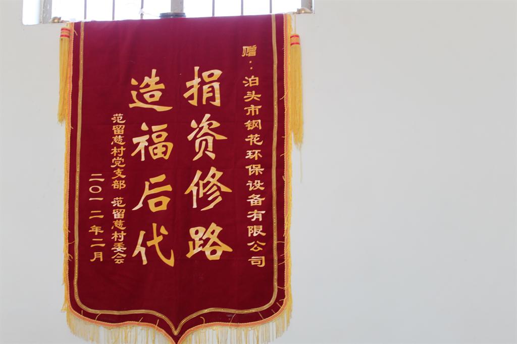 2012年年初,我公司組織全體員工對河北省泊頭市范留慈村修路活動進行捐資,范留慈村的黨支部及村委會向我公司獻錦旗,捐資修路,造福后代。為了我們的后代,要致富,先修路的原則,造福我們的農民朋友。